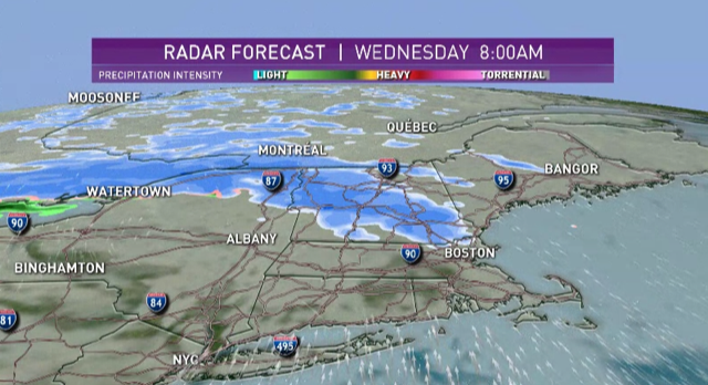 Scattered rain heads in late in the evening on Wednesday and will continue to be off and on overnight. The rain may be heavy at times, with some rumbles of thunder across southern New England Thursday afternoon.