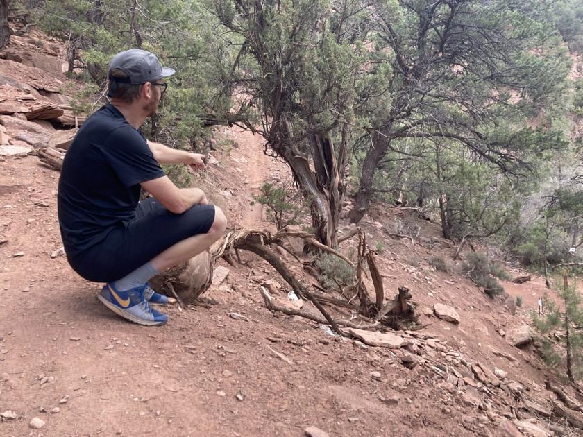 On a recent hike, he picked up a small, flat chunk of hardened soil. “This dirt is fluffier,” he says, as it crumbles easily between his fingers, sprinkling loose, red dirt back down. “It does this and doesn’t bind together.”